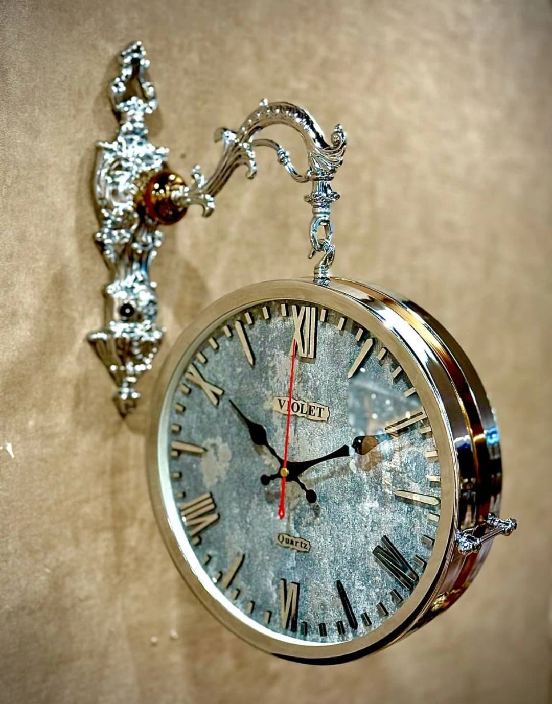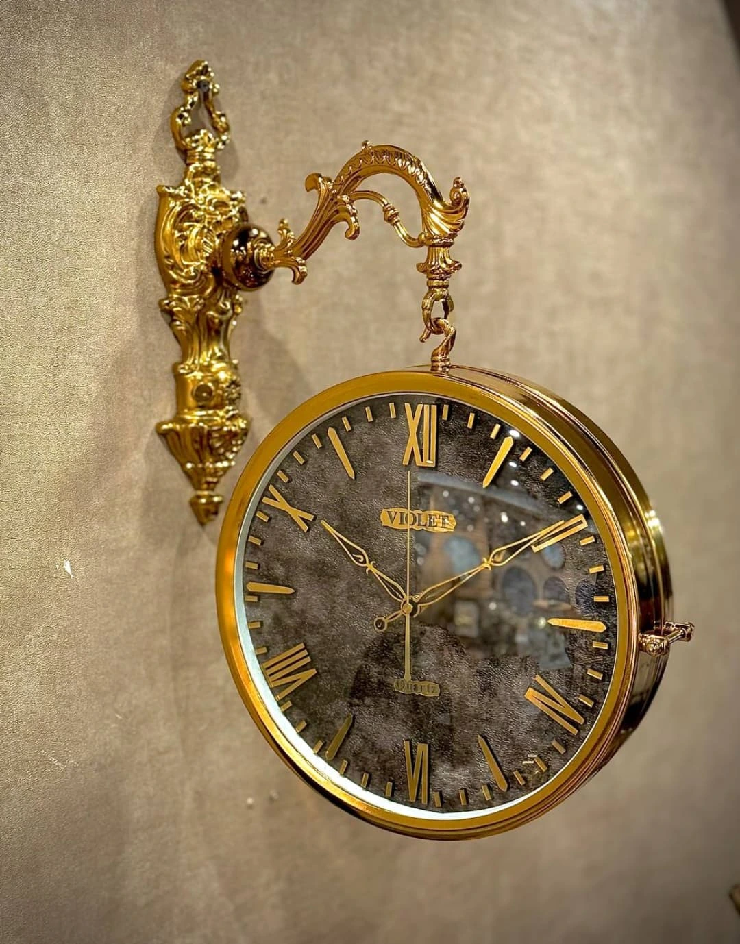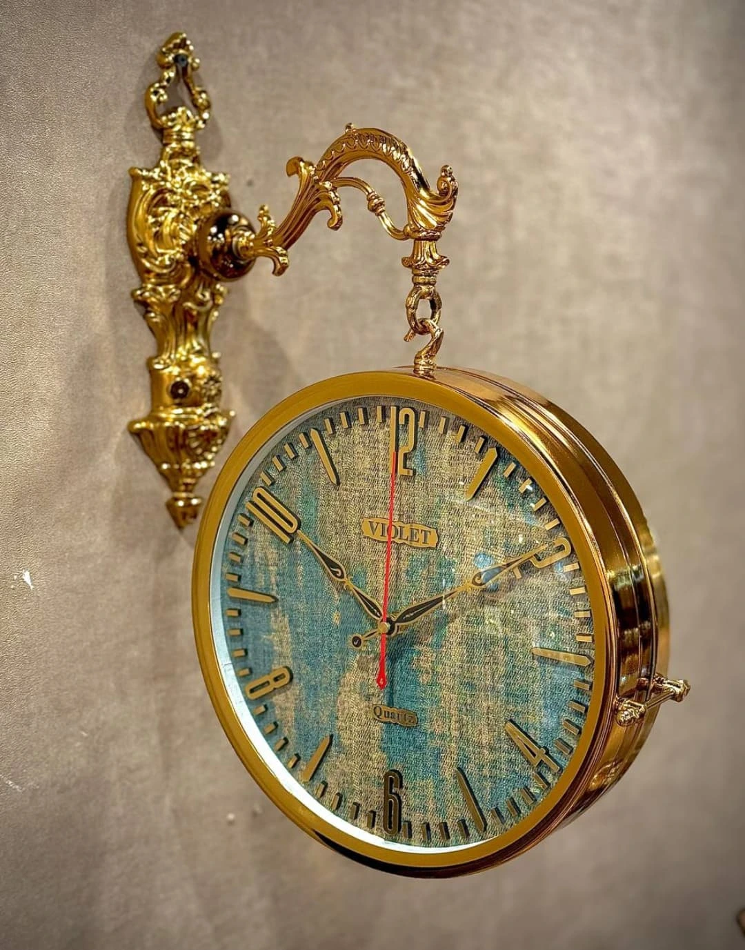 ساعت دوطرفه فلزی مارک ویولت جنس بدنه از فلز آبکاری فورتیک صفحه کاغذ دیواری با اعداد برجسته مولتی قطر صفحه ۳۵ سانت